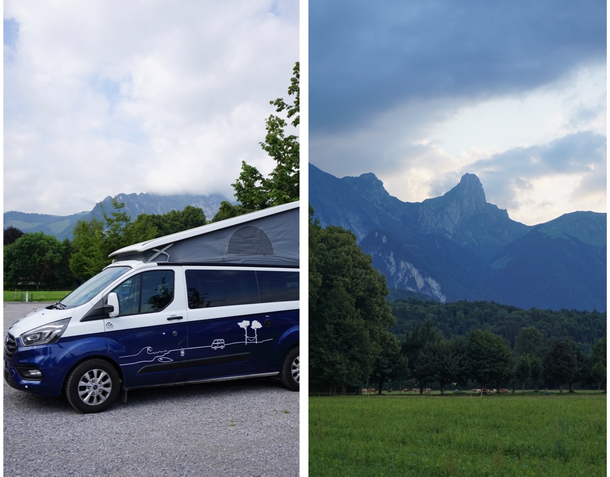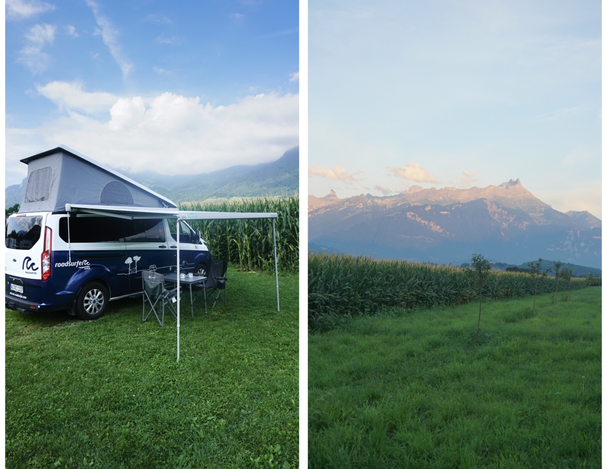 Pour nos dernières nuits en Suisse, nous avons trouvé un emplacement à la Ferme des Meleys, grâce à l’application Roadsurfer spots qui propose des endroits un peu hors des sentiers battus, à tous les prix. L’emplacement se trouve à Aigle et est vraiment agréable, près des champs de maïs et des montagnes. Il est aussi possible de s’approcher des animaux, tels que les vaches et les poules. La ferme propose leurs propres produits en libre-service mais nous avons trouvé les prix un peu élevés. A noter qu’il n’y a pas de douche et de sanitaires. En revanche, il y a un robinet pour faire sa vaisselle.