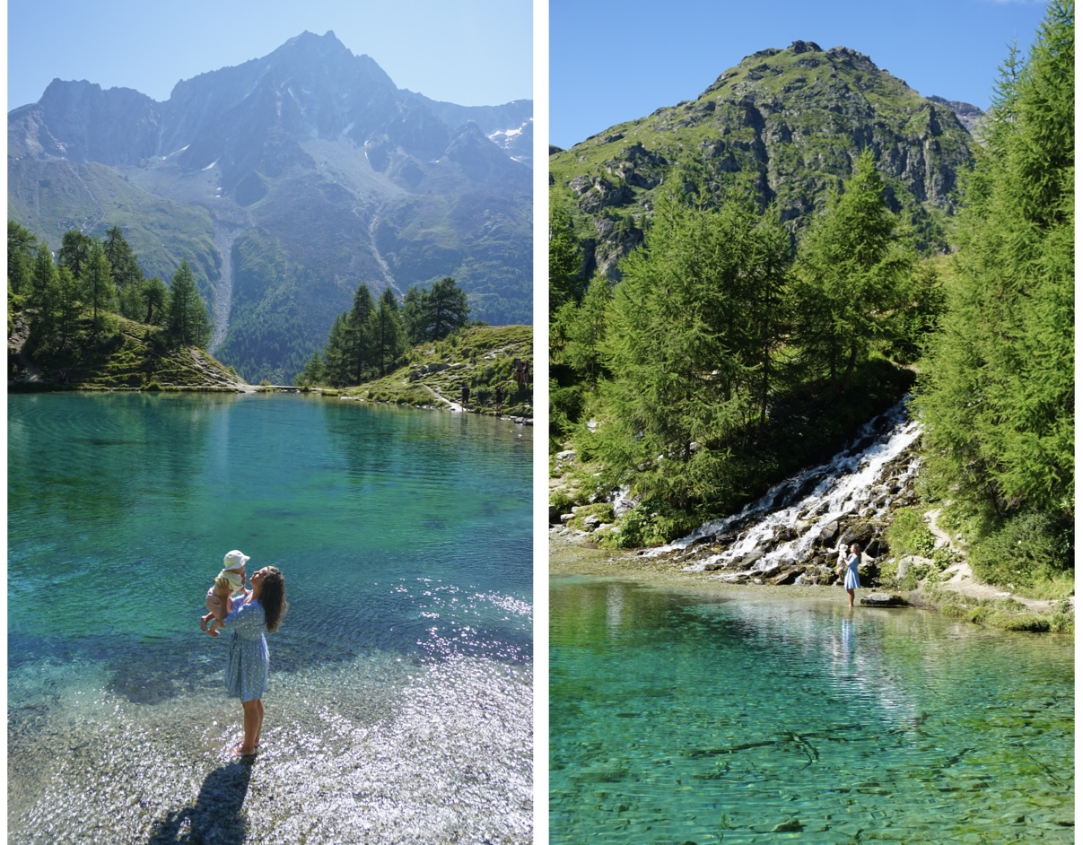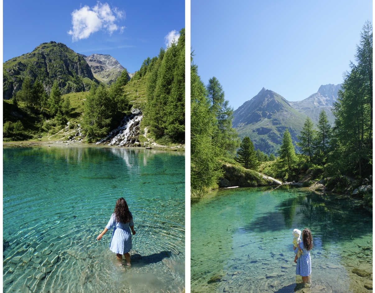 Le programme de ce matin est de se rendre au Lac bleu d’Arolla, un autre lac qui nous fait de l’oeil depuis un moment. Après 15 minutes de route, nous arrivons au hameau de La Gouille, d’où part la randonnée. Elle ne dure que 40 minutes mais ça grimpe pas mal tout le long. Elle reste accessible et familiale, nous croisons un peu de monde, d’autant plus que nous l’avons démarrée à 10h, un peu plus tard que notre habitude… Une fois arrivés sur place, nous ne sommes pas déçus du tout. La couleur de l’eau est superbe, en revanche elle est glacée. J’ai trempé mes jambes jusqu’aux mollets, ça devenait même douloureux tellement le froid était saisissant. Derrière le lac, les montagnes se dressent au milieu des sapins… 🌲 Juste à côté, se trouve un autre lac, bien plus petit, mais tout aussi charmant. Nous y avons finalement passé pas mal de temps avant de redescendre.