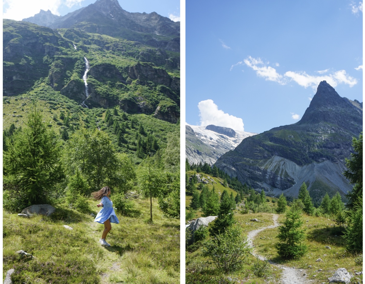 Nous avons décidé de continuer notre journée par la randonnée jusqu’au Glacier du Mont Miné qui débute au village de Ferpècle. On s’est d’abord garés le long de la route, juste avant le restaurant Le Petit Paradis. Nous avons ensuite marché le long de la route jusqu’au barrage de Ferpècle, puis nous avons continué par le sentier arboré pour ensuite longer la rivière et arriver au glacier du Mont Miné en une trentaine de minutes. Des paysages variés se succèdent : montagnes, cascade, forêt, rivière, puis une magnifique vue sur le glacier ! On a vraiment apprécié cette randonnée pour ce cadre riche et diversifié ! Elle est aussi très accessible car c’est du plat tout le long. Après la petite grimpette de ce matin, c’est appréciable pour les jambes ahah !
