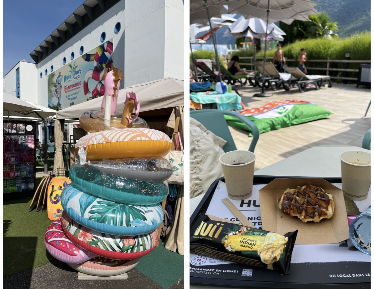 Notre séjour en Suisse touchant bientôt à sa fin, nous avons décidé de nous faire plaisir à tous les 3 et de passer l’après-midi à Aquaparc, un grand parc aquatique qui se situe à Port-Valais ! Il fait en plus très chaud aujourd’hui, cela sera d’autant plus appréciable de se rafraîchir dans l’eau. A l’accueil, il vous faudra payer vos entrées et si vous souhaitez manger quelque chose sur place, rajouter un peu d’argent pour avoir des « jetons » utilisables dans les snacks.